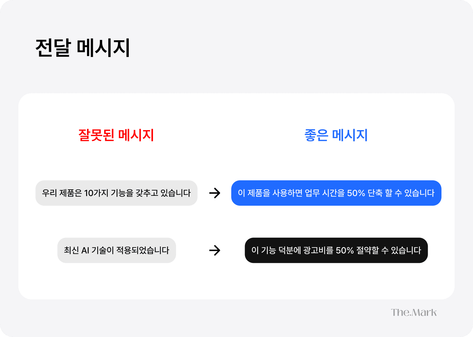 ❌ 불분명한 메시지 → “좋은 서비스입니다” (X) → “지금 가입하면 1개월 무료!” (O)
