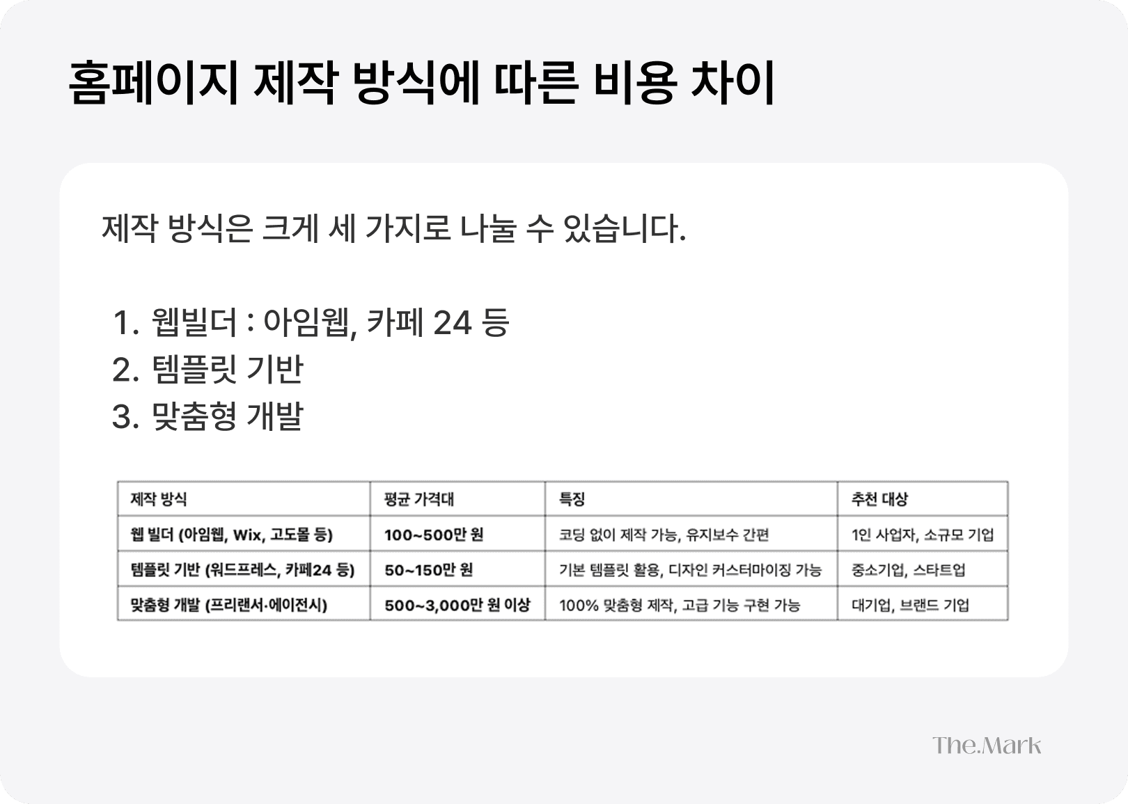 • 웹 빌더, 템플릿 기반, 맞춤형 개발 등 제작 방식에 따라 비용 차이가 발생합니다.