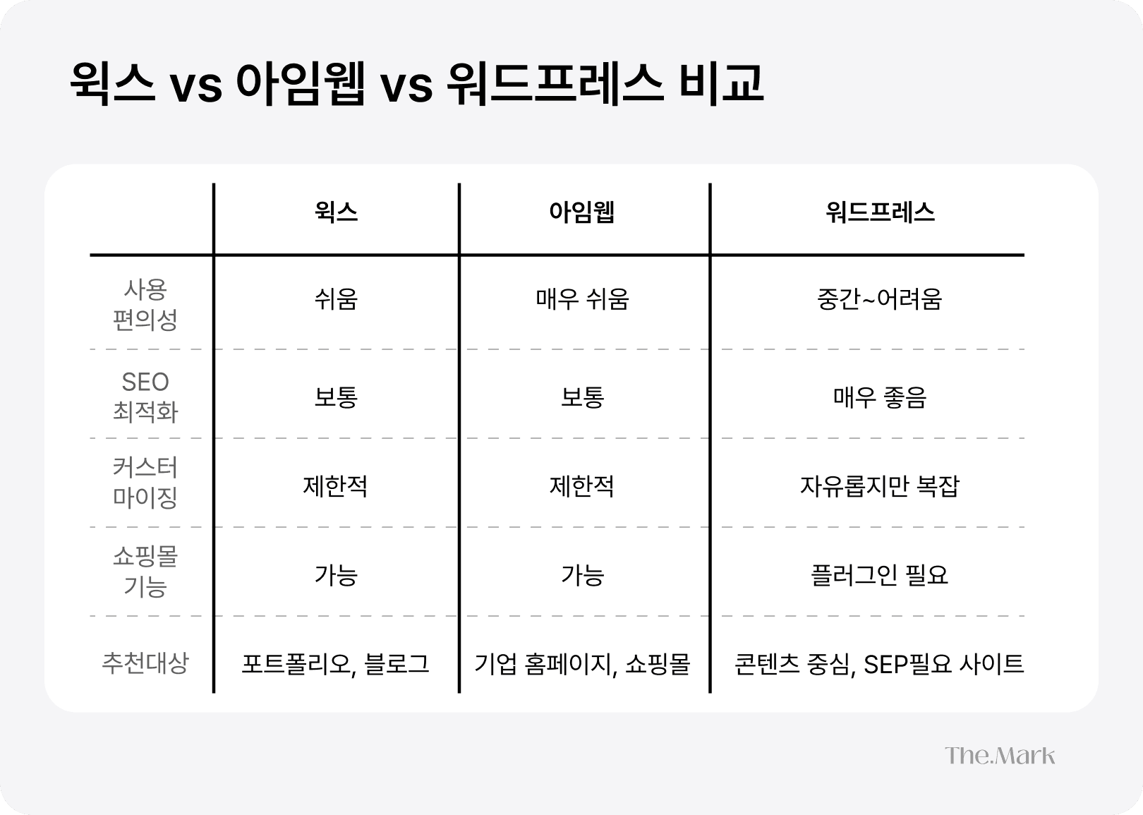 • 윅스는 초보자에게 편리하지만, 템플릿 변경의 제약과 글로벌 호스팅 속도가 문제일 수 있습니다.