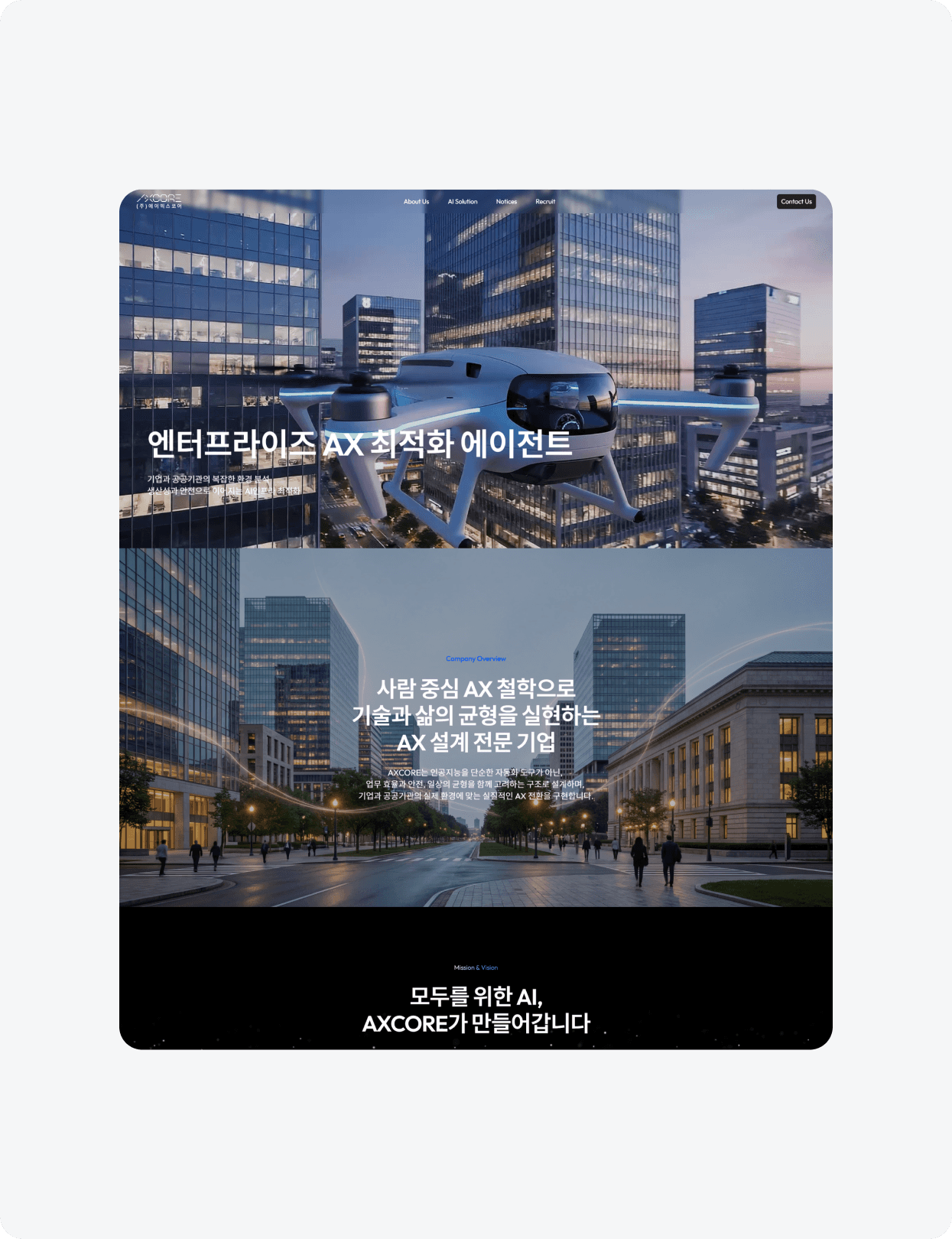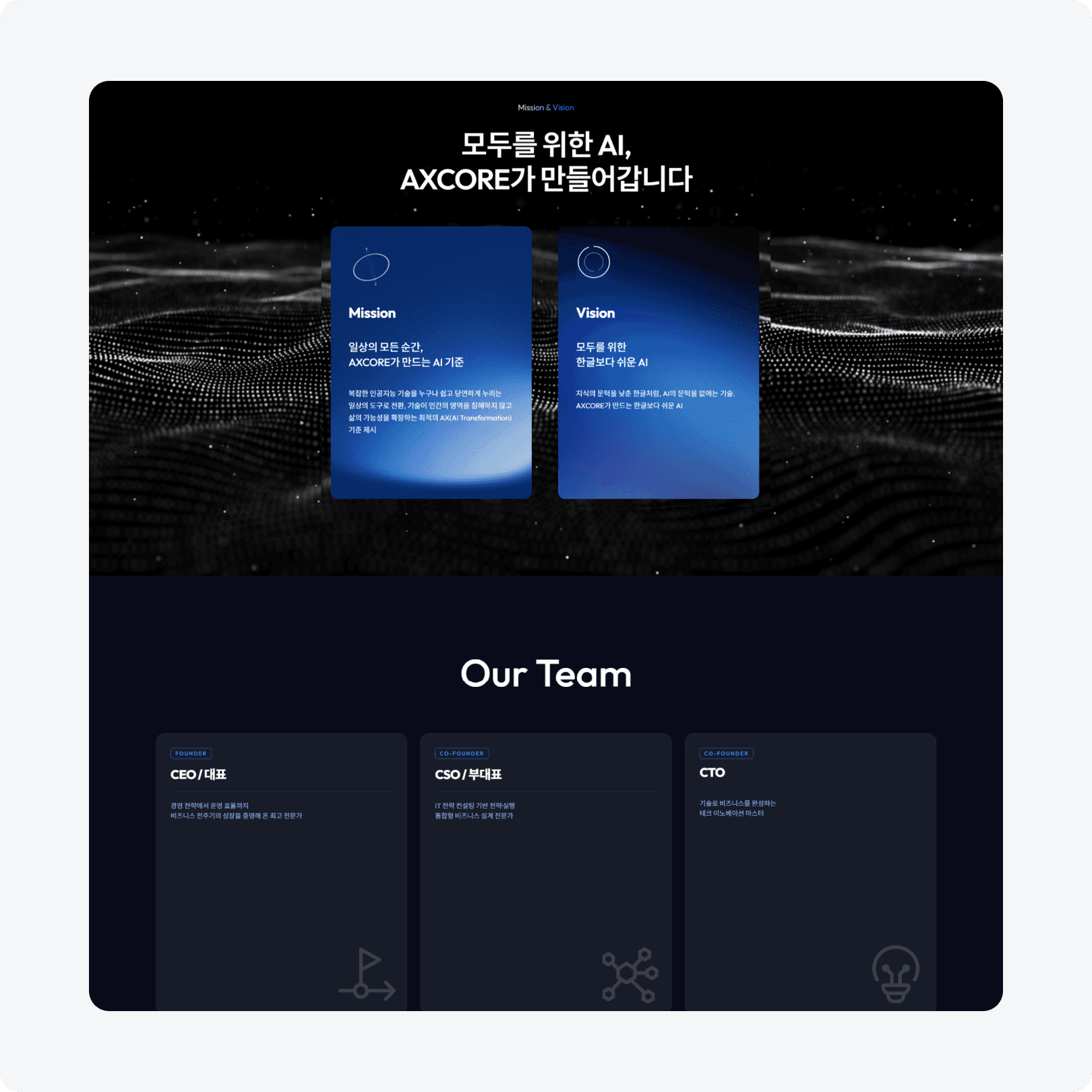 AXCORE는 인공지능 기반 AX(AI Transformation) 설계를 제공하는 스타트업으로, 초기 단계 특성상 전달할 수 있는 콘텐츠가 제한적인 상황이었습니다. 이번 프로젝트는 부족한 정보를 단순히 나열하는 것이 아니라, 기업의 방향성과 강점이 명확하게 드러나도록 구조를 설계하는 데 중점을 두고 진행되었습니다.