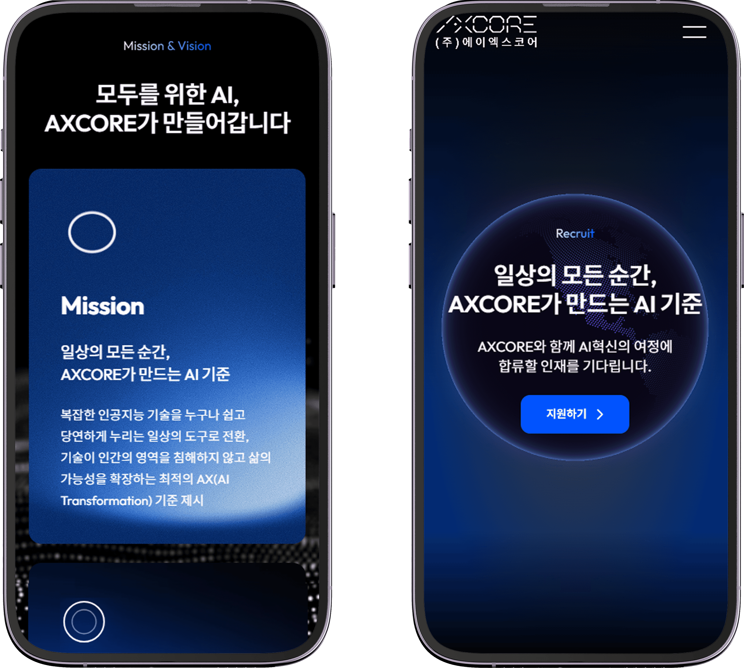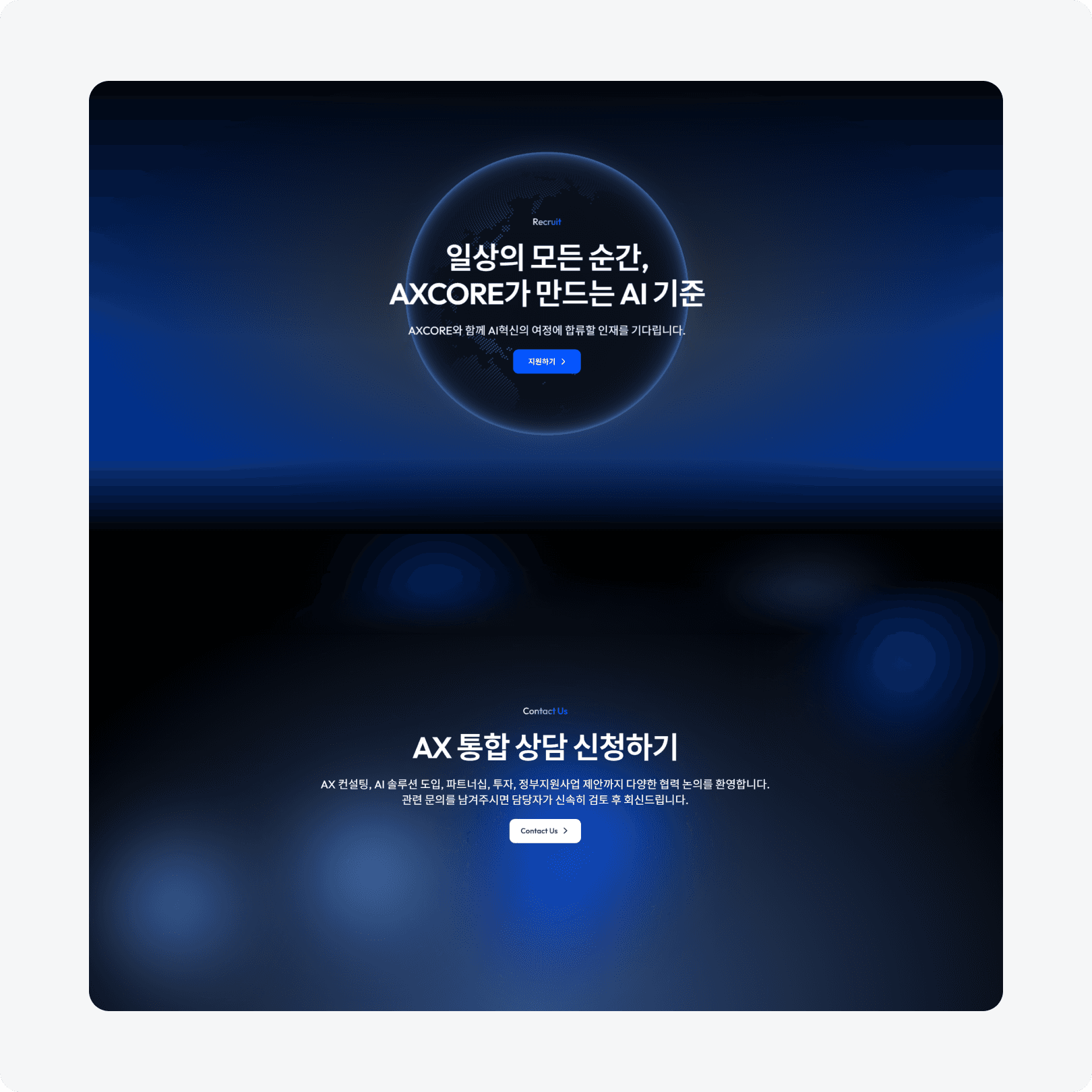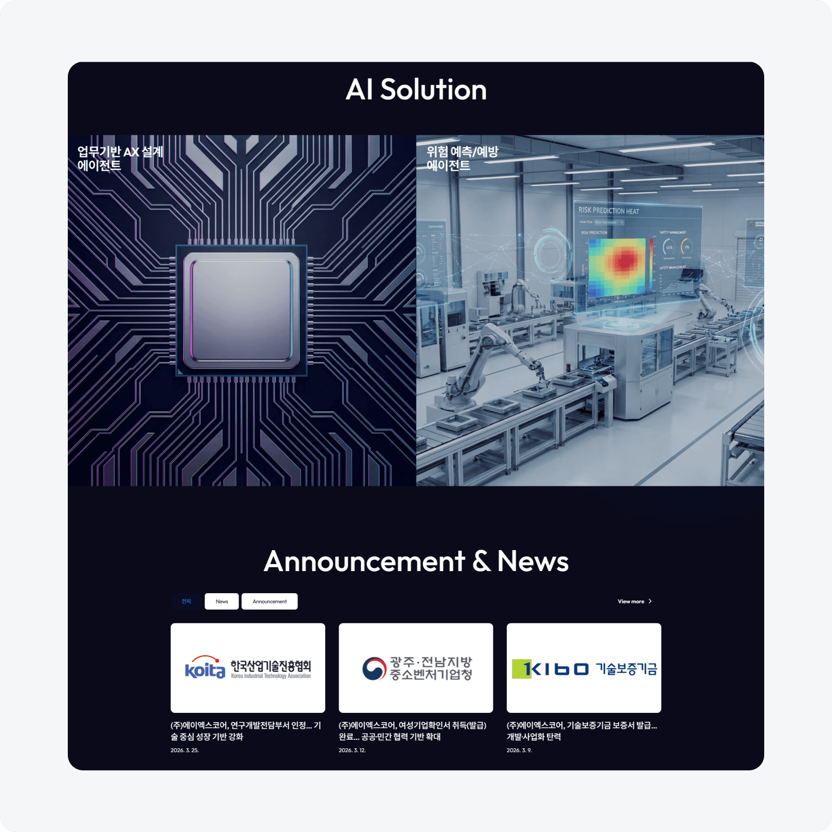 메인 페이지는 방문자가 처음 접했을 때 AXCORE의 핵심 메시지와 차별점이 즉시 전달될 수 있도록 구성했으며, 사람 중심의 AX 철학과 기술 방향성이 자연스럽게 이해될 수 있도록 콘텐츠 흐름을 정리했습니다. 또한 People 섹션을 통해 핵심 인력의 전문성과 신뢰를 강조하고, 사업 영역이 한눈에 들어오도록 구조화하여 스타트업임에도 불구하고 안정적인 기업 이미지를 전달할 수 있도록 설계했습니다.
