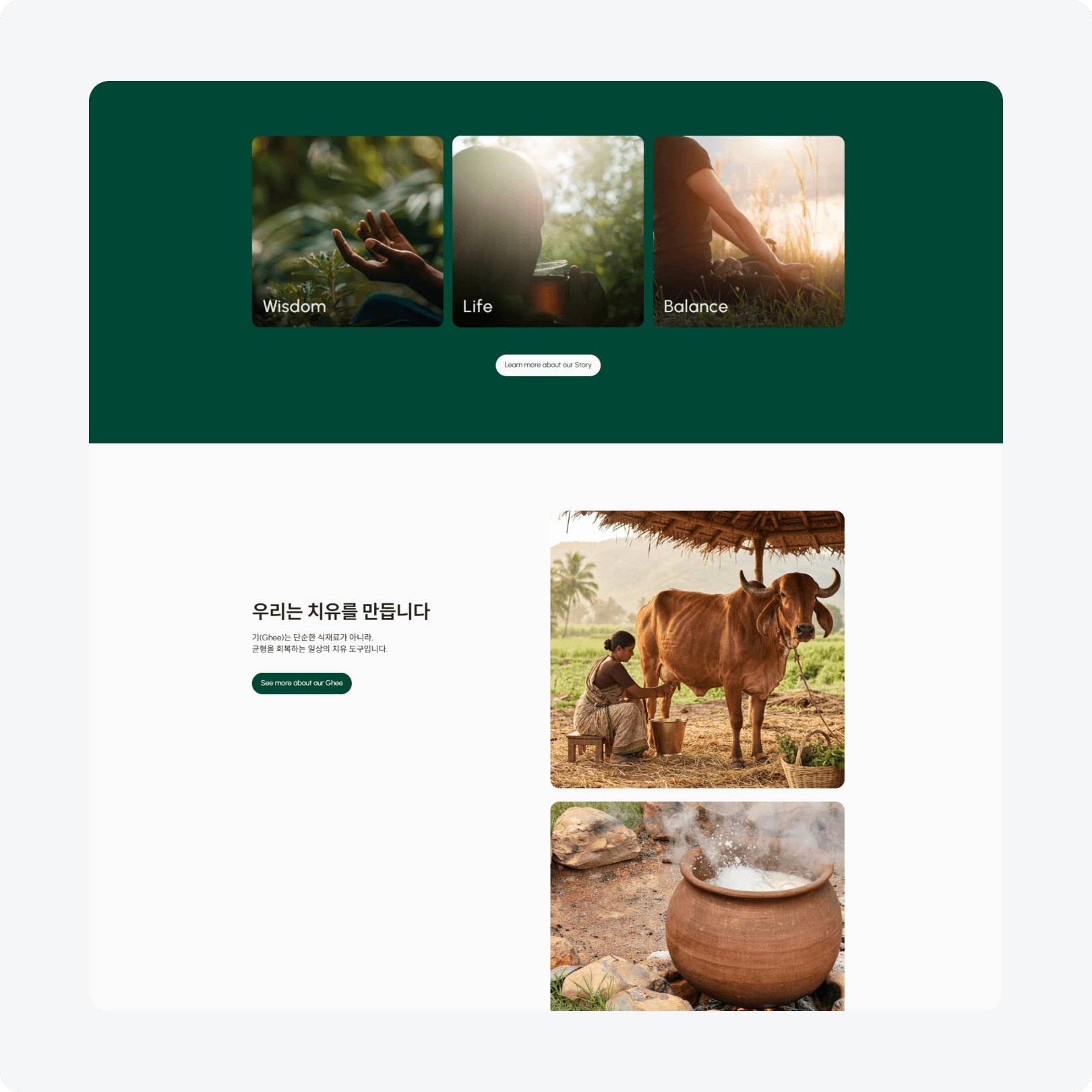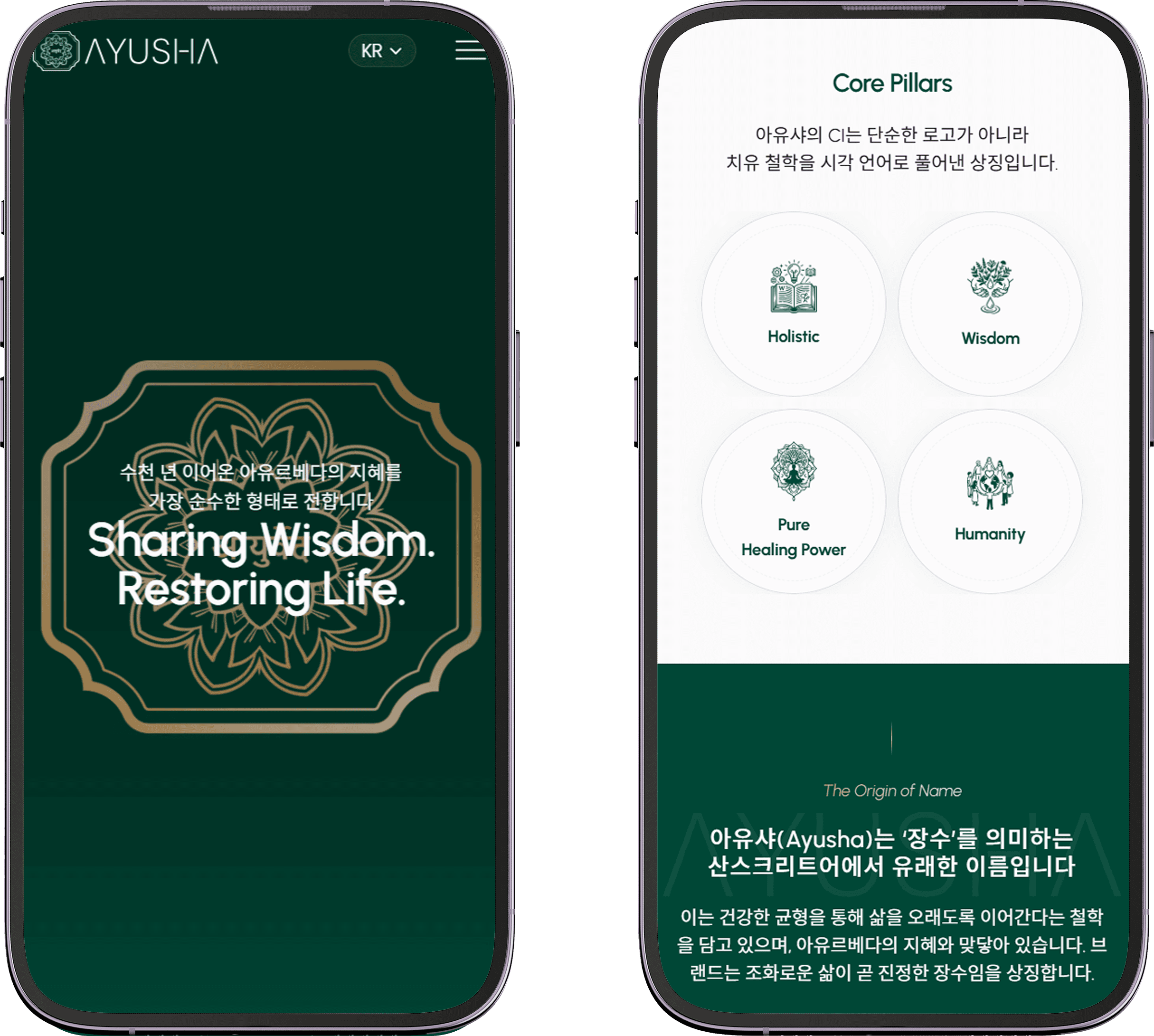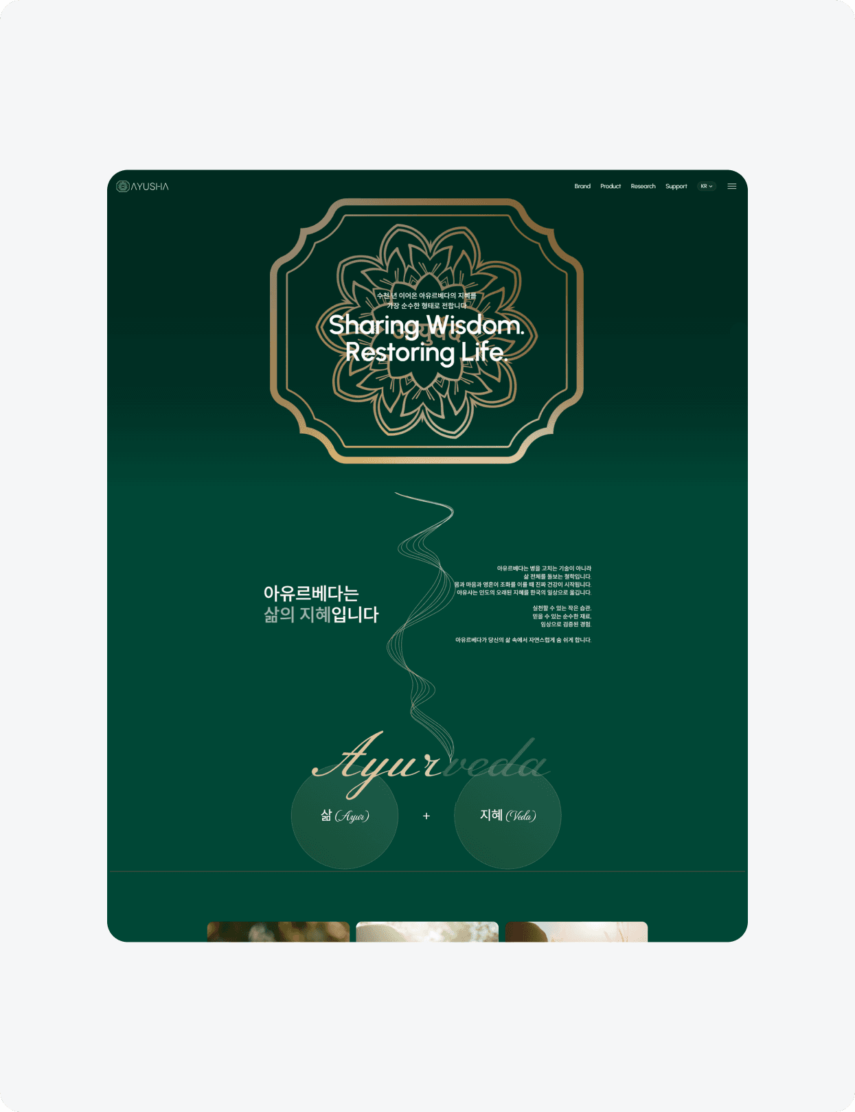이번 프로젝트는 브랜드 사이트와 쇼핑몰을 함께 구축하는 신규 제작으로 진행되었으며, 단순한 제품 판매를 넘어 브랜드의 세계관과 철학이 자연스럽게 전달되도록 설계하는 데 집중했습니다. 사용자가 처음 접하더라도 아유르베다의 개념을 부담 없이 이해하고, 브랜드가 지향하는 가치에 공감할 수 있도록 전체 콘텐츠 흐름을 구성했습니다.