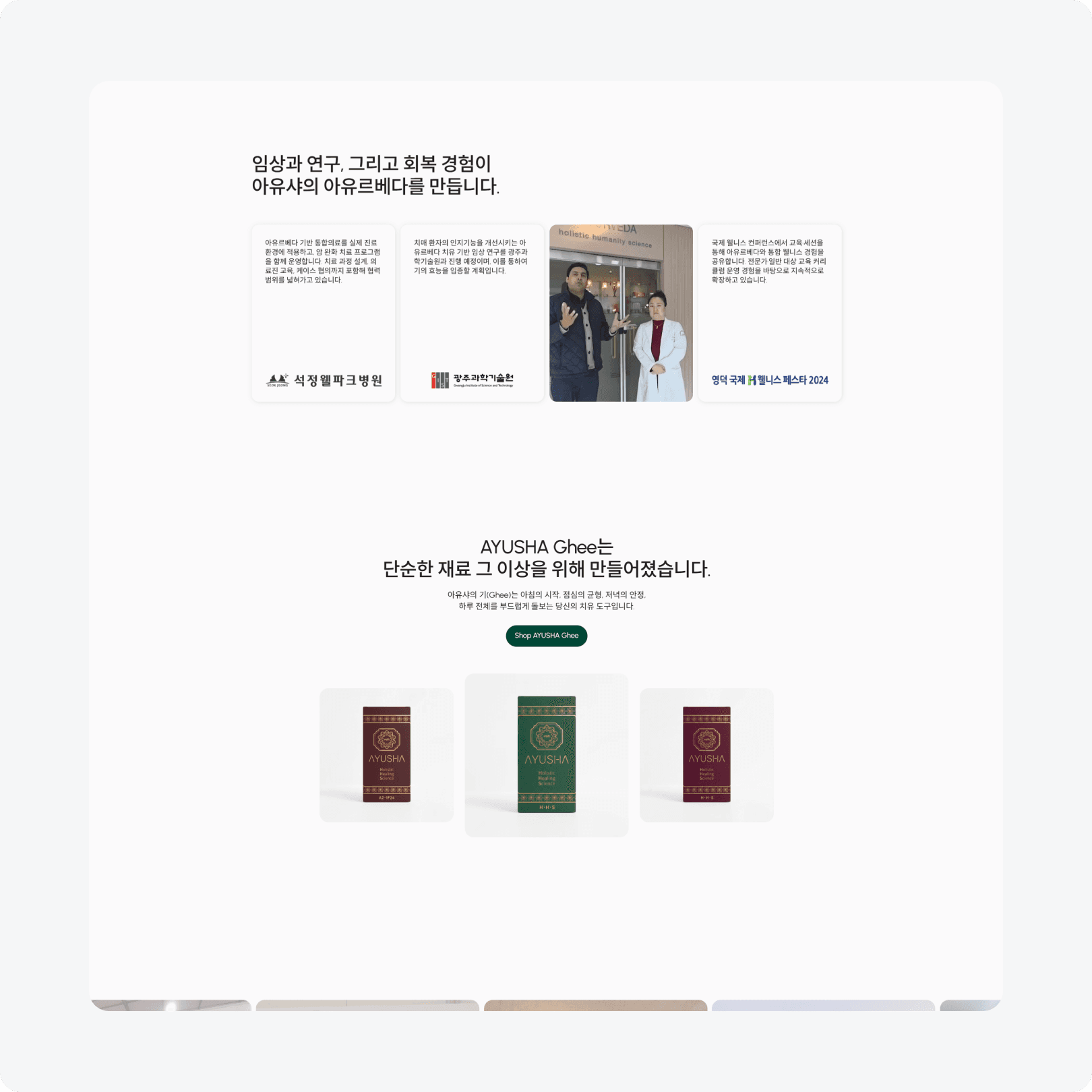 아유샤는 아유르베다 기반의 기버터 제품과 다양한 서비스를 제공하는 브랜드로, 고대 자연의학의 철학을 현대의 일상에 전달하고자 하는 방향성을 가지고 있습니다. 하지만 아유르베다는 국내에서 아직 생소한 개념이기 때문에, 브랜드의 철학과 가치를 효과적으로 전달할 수 있는 구조와 디자인이 무엇보다 중요한 프로젝트였습니다.