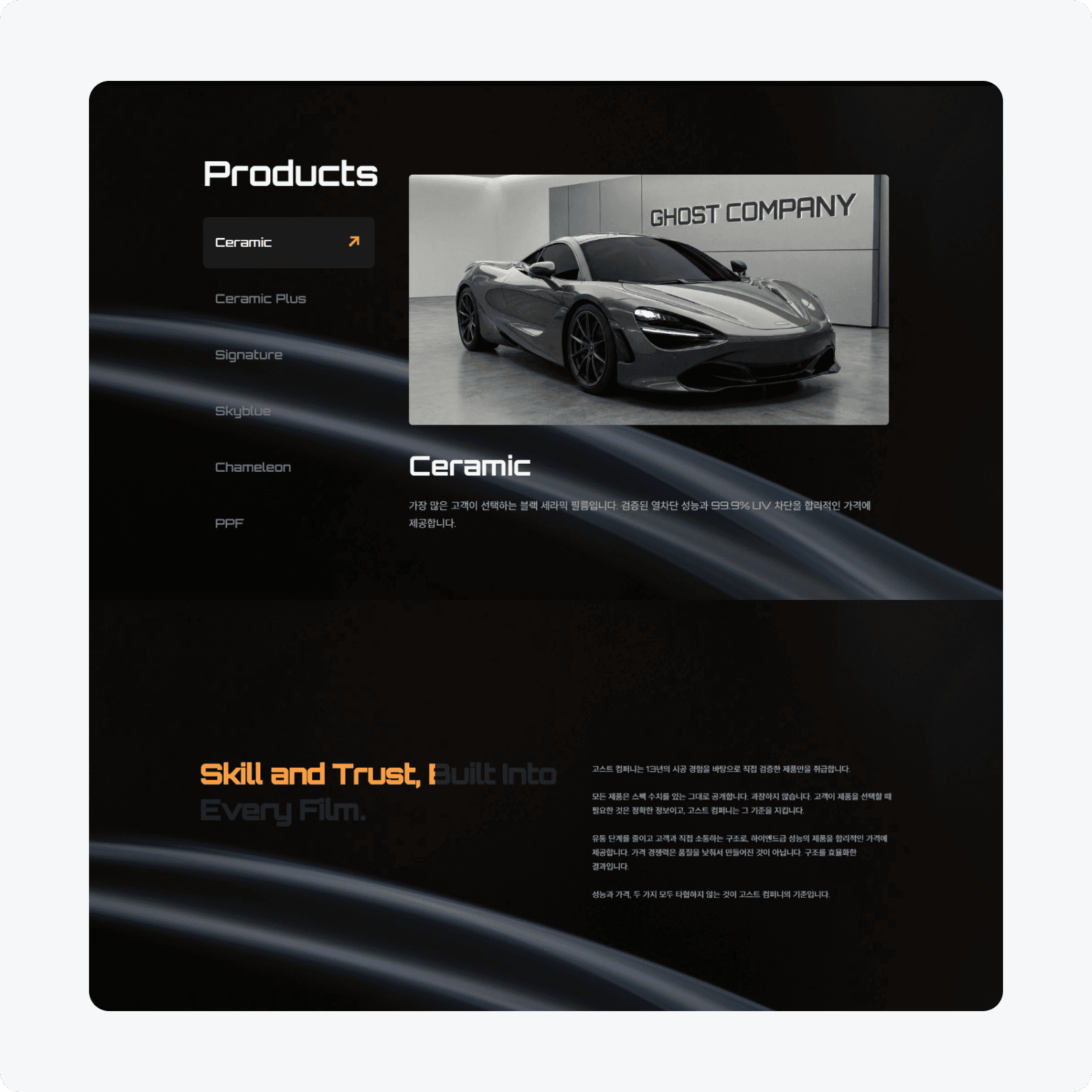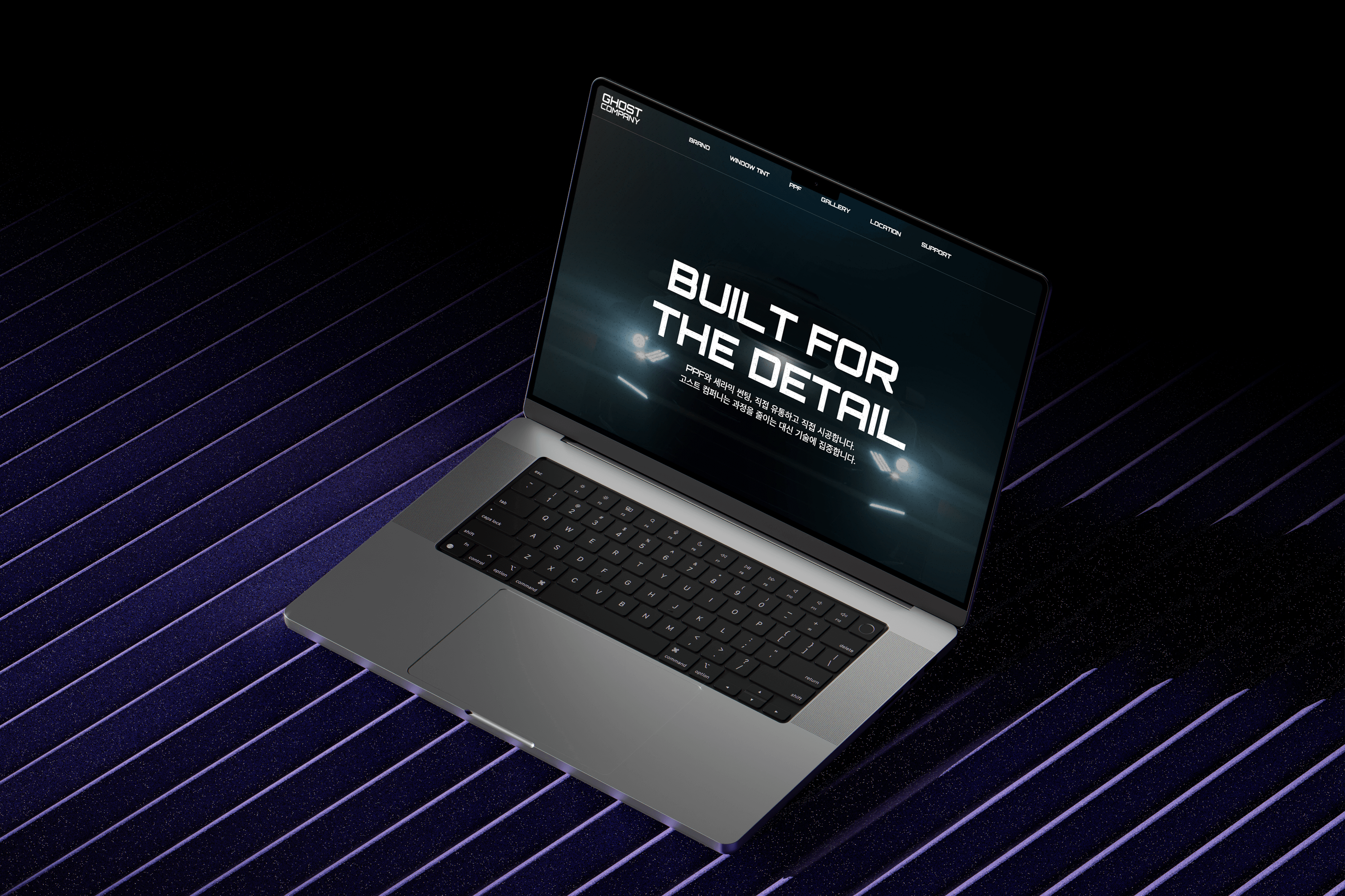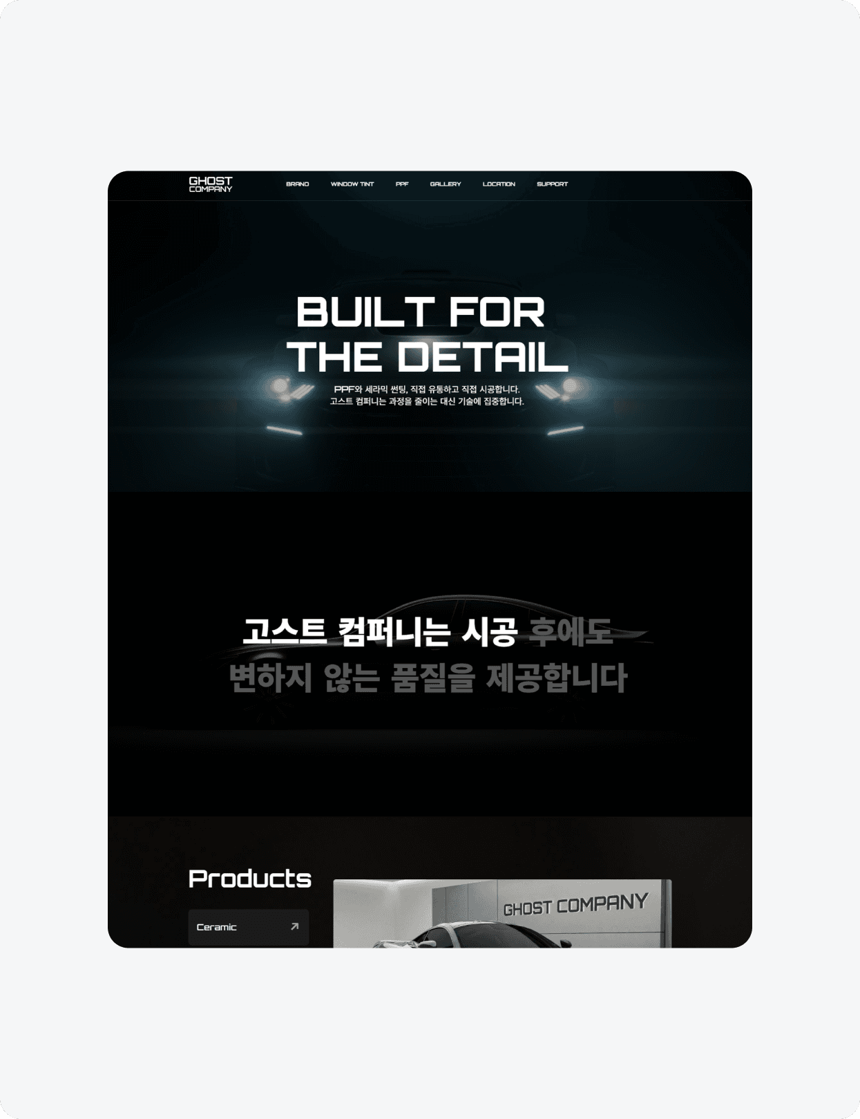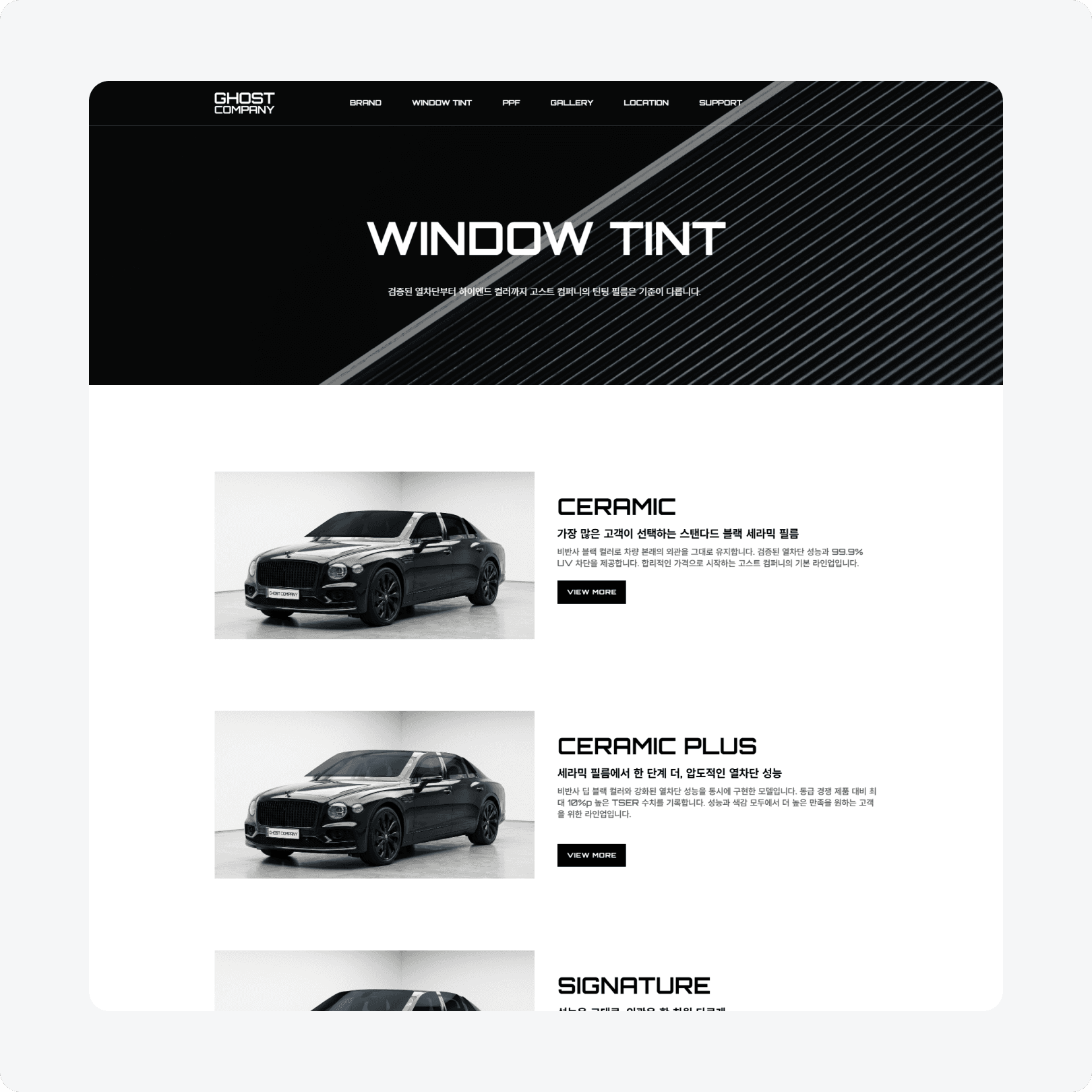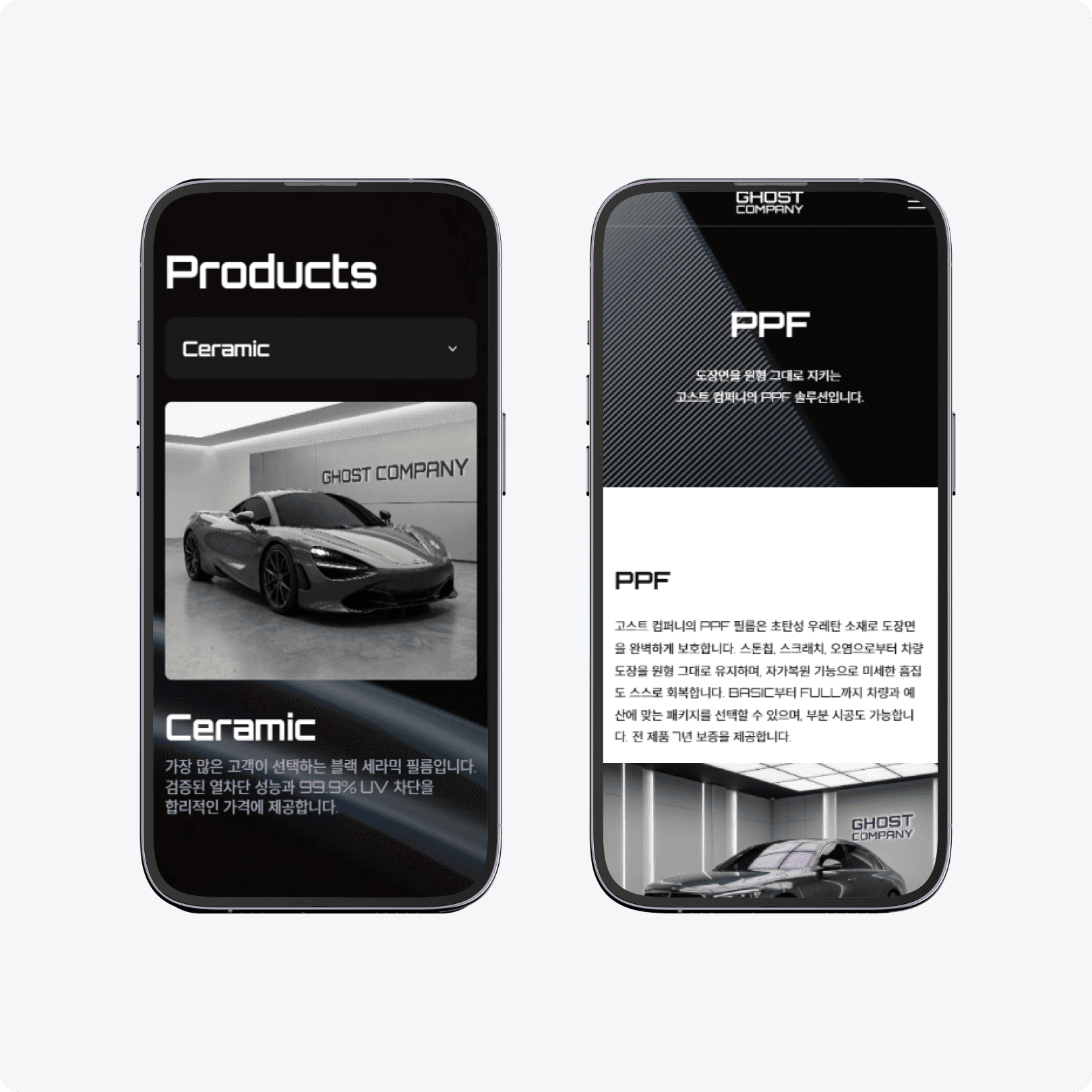 고스트컴퍼니는 틴팅 및 PPF 시공을 전문으로 하는 브랜드로, 자사 제품과 시공 역량을 효과적으로 전달할 수 있는 브랜드 중심의 웹사이트가 필요했습니다. 이번 프로젝트는 신규 제작으로 진행되었으며, 브랜드 이미지 구축과 함께 제품 이해도와 사용자 편의성을 동시에 높이는 데 집중했습니다.