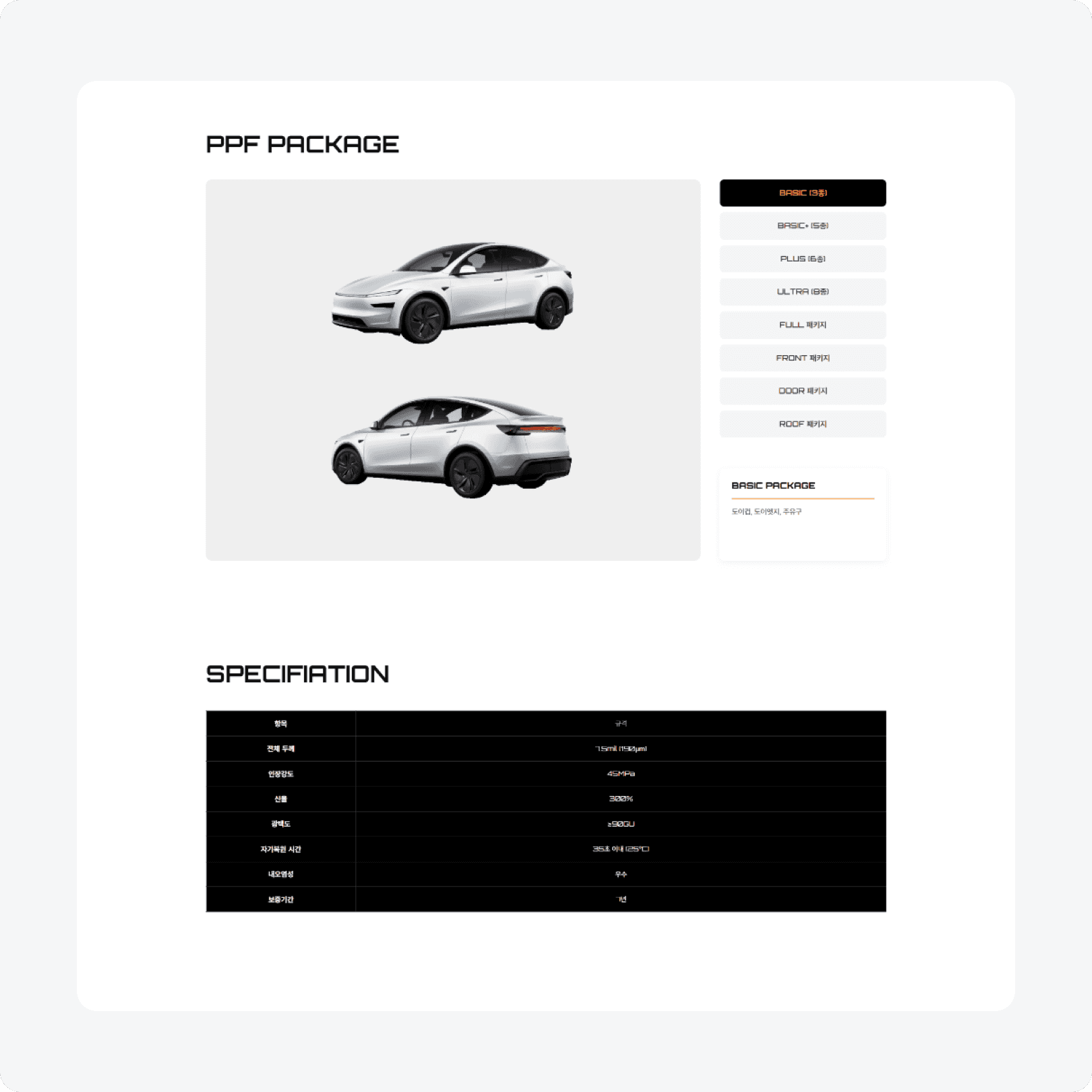 특히 PPF 패키지는 사용자 입장에서 직관적으로 이해할 수 있도록 설계했습니다. 각 패키지별 시공 부위를 한눈에 확인할 수 있도록 GIF를 제작하고, 패키지 선택 시 해당 시공 부위가 바로 보여지도록 구현하여 복잡할 수 있는 정보를 쉽게 전달했습니다.