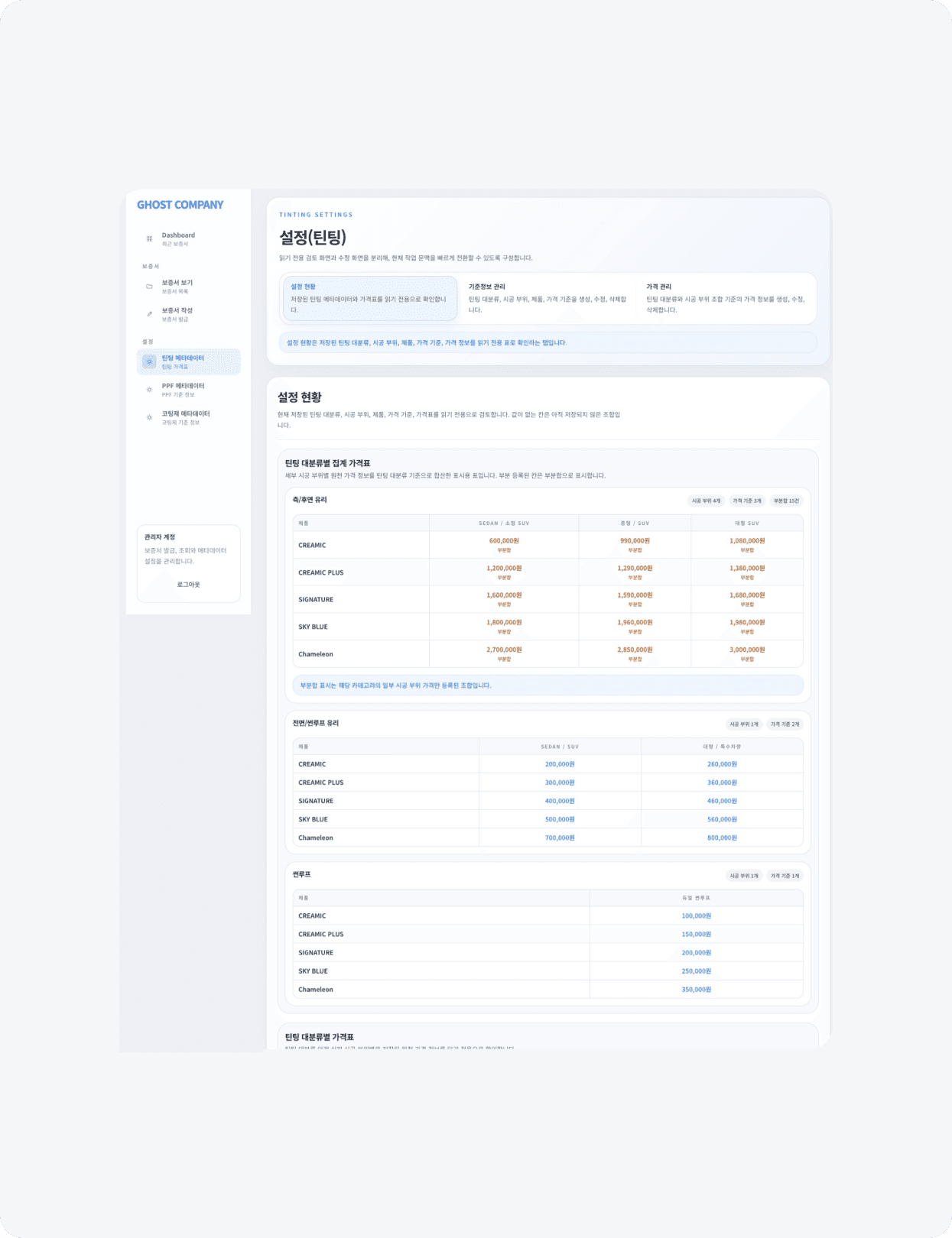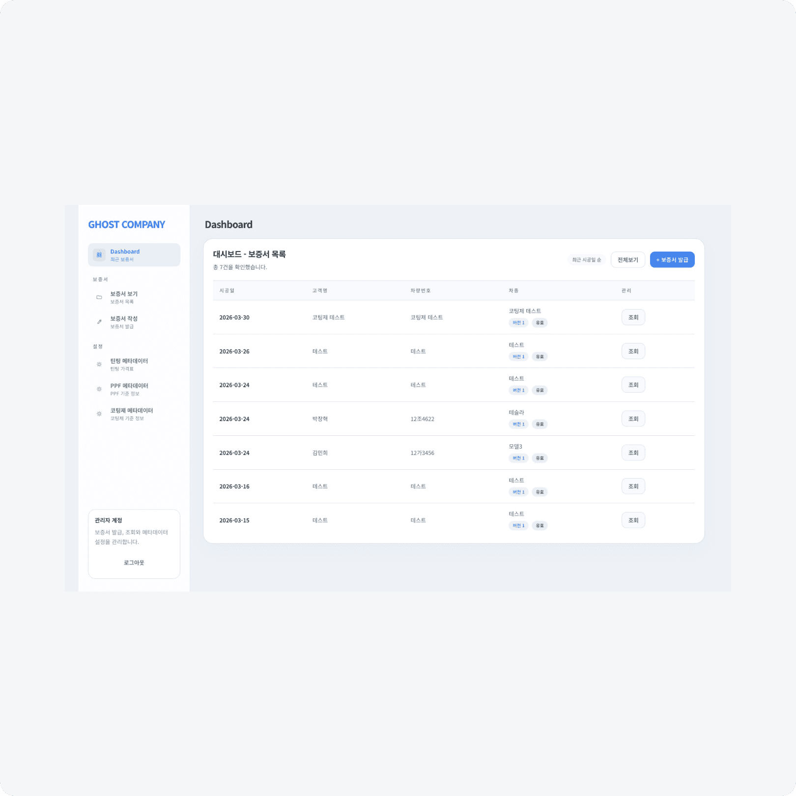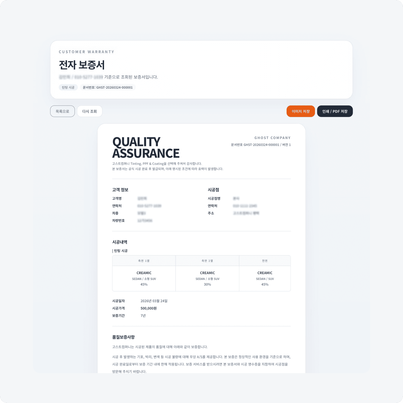 고스트컴퍼니는 틴팅 및 PPF 시공을 진행하며, 시공 이후 보증서 발급과 고객 안내를 보다 빠르고 정확하게 처리할 수 있는 시스템이 필요한 상황이었습니다. 이에 따라 현장에서의 업무 효율을 높이기 위한 웹 프로그램 제작을 진행했습니다.