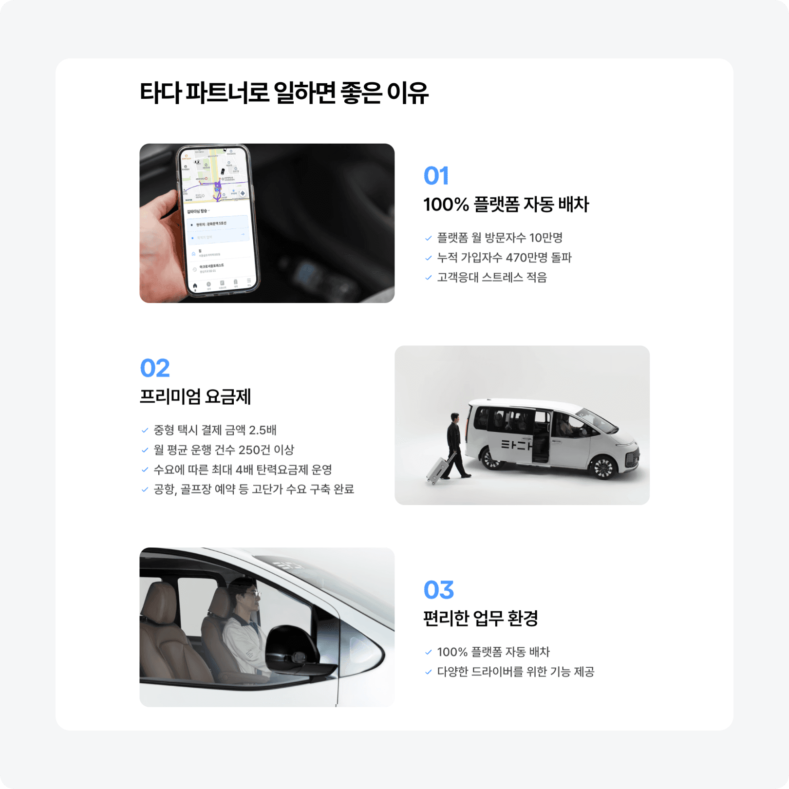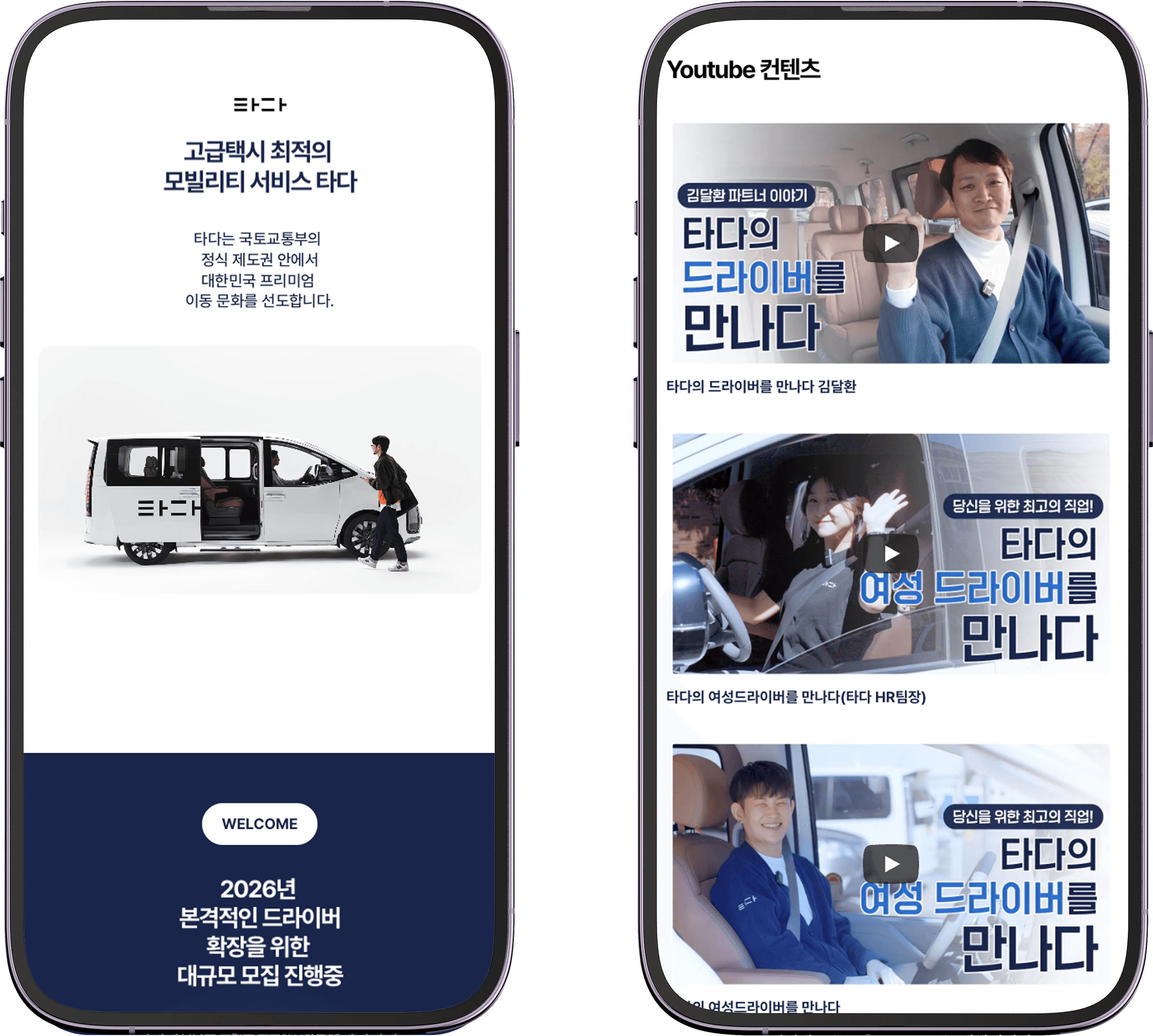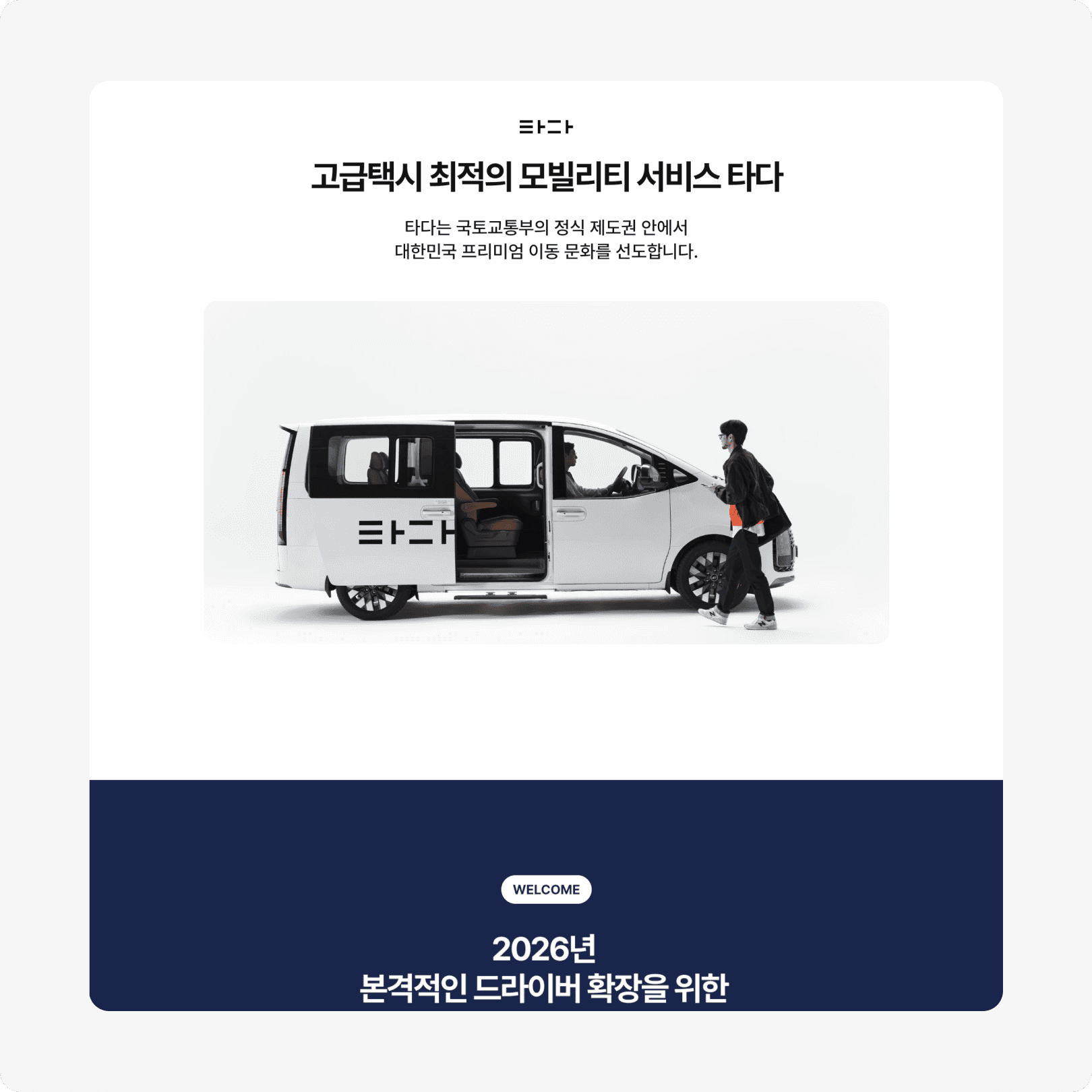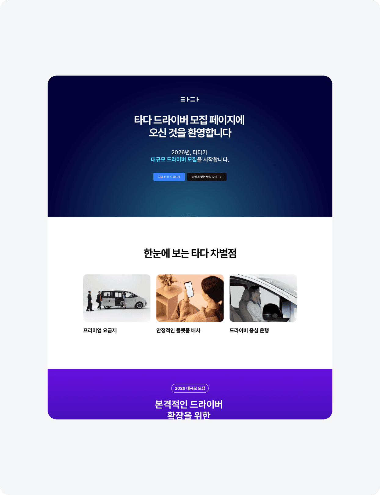 또한 2026년 드라이버 모집이라는 목적에 맞게 타다의 차별점과 혜택을 명확하게 전달하면서, 각 유형별 페이지에서는 조건, 장점, 운영 방식 등을 직관적으로 비교하고 이해할 수 있도록 콘텐츠를 구성했습니다.